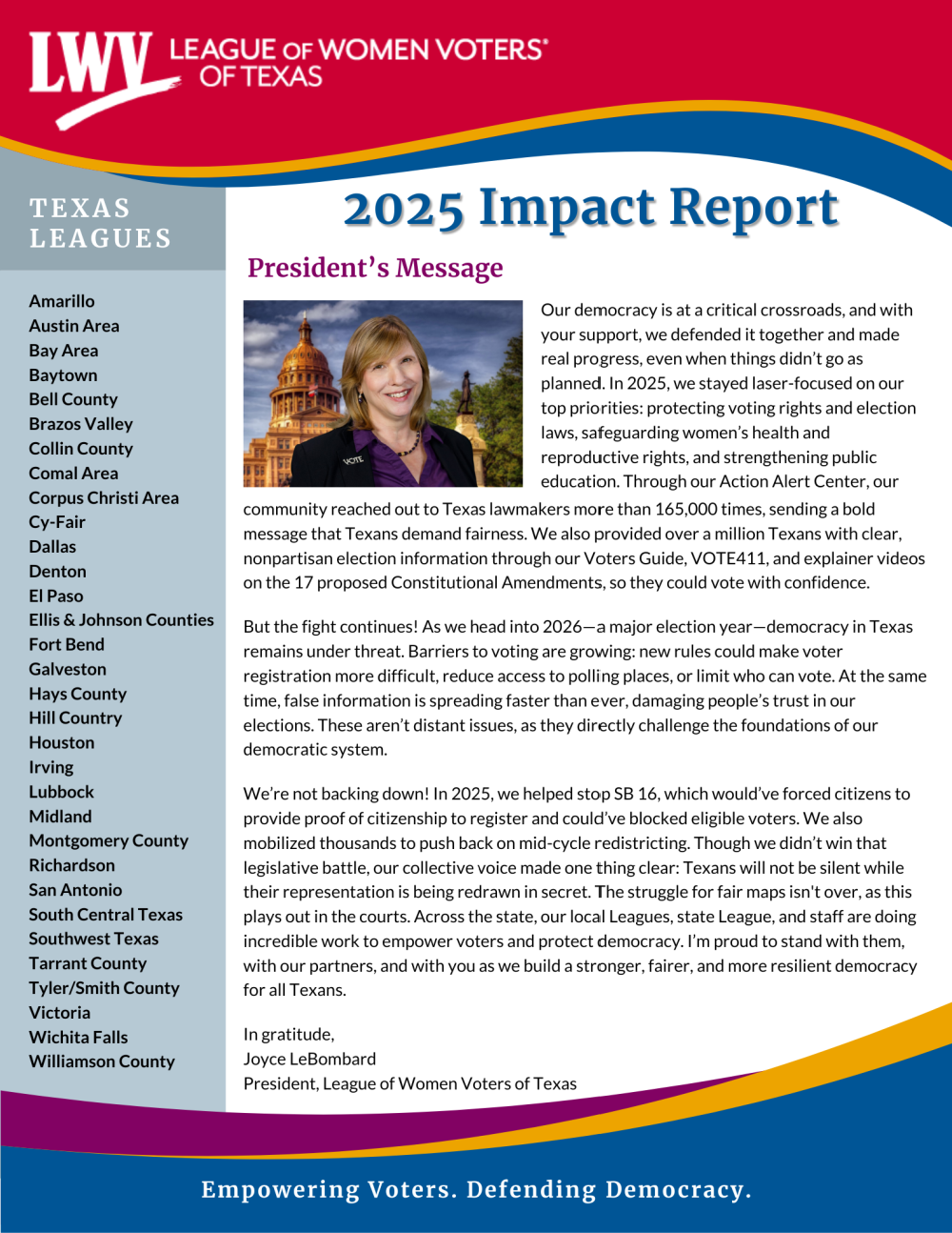 Every year, the League of Women Voters of Texas publishes an impact report, which highlights successes, accomplishments, and obstacles faced over the past calendar year.